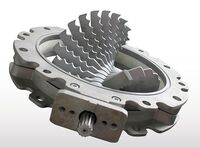 Das Gehäuse des LBC besteht aus einem Aluminium-Druckgussgehäuse mit Ein- und Auslaufflansch, einem integriertem Brechwerkzeug, das von einem seitlich angebauten Getriebemotor angetrieben wird, und einem starren Gitter, durch welches das Schüttgut in den nächsten Prozessschritt gelangt.